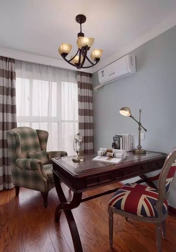书房的装修,地面采用了仿实木地板铺设,墙面刷上淡蓝色,配合复古的美式书桌、沙发、坐椅,非常的大气。