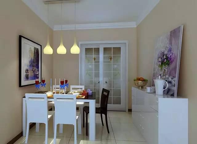 现代简约风格的小餐厅装修,米黄色的墙面配合白色的餐桌餐椅,显得非常舒服。三盏暖黄色的小吊灯,让用餐的环境显得更加温馨。