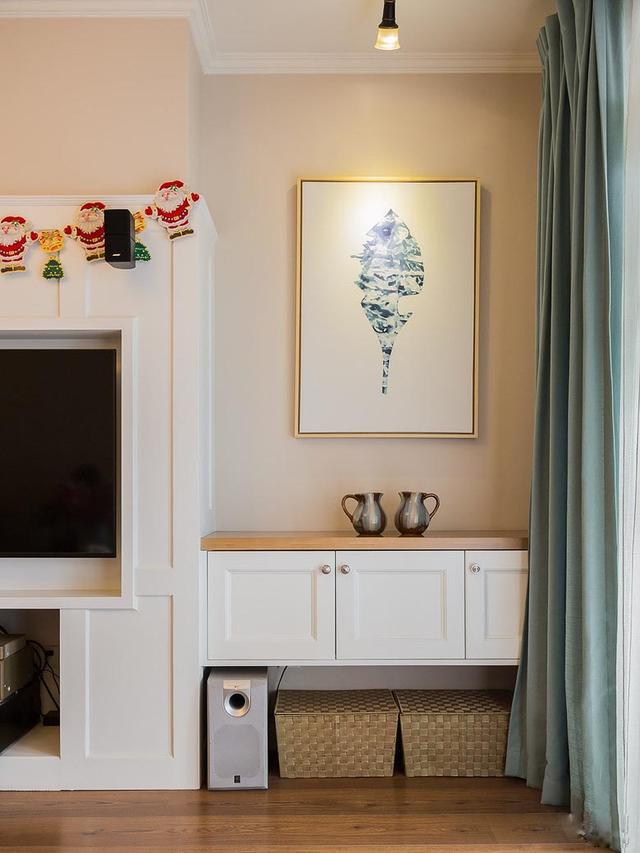 最喜欢的就是电视背景墙,订制的嵌入式白色电视柜,将电视包裹其,再也不用担心会碰倒电视了。浅绿色的布艺沙发,配合着深棕色的实木茶几,自然的田园气息洋溢。