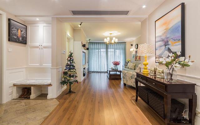 进门就看见深棕色的实木玄关柜,配合着窄边框的挂画、优雅的台灯、简单的装饰品,乡村气息扑面而来。