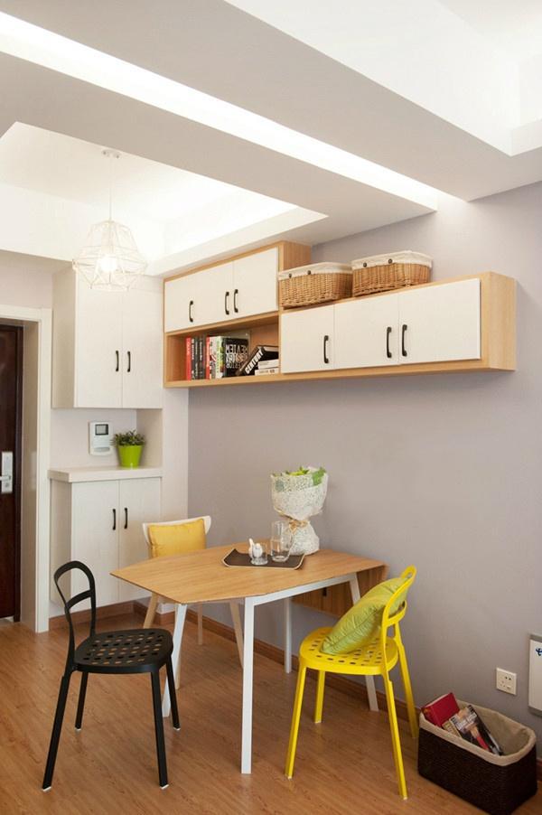 面积过小,只能在客厅隔出一小块来做餐厅。餐桌是特意挑选可以折叠收缩的款式,非常实用。还有餐桌上方的吊柜,每个来串门的邻居都说非常实用,也非常漂亮。