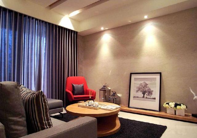 电视背景墙采用仿古面大理石制作,配合温润自然的木质圆形茶几,整体感觉非常的沉稳且温暖舒适。深灰色的布艺沙发,配合非常有质感的深色窗帘,整个空间贵气十足。