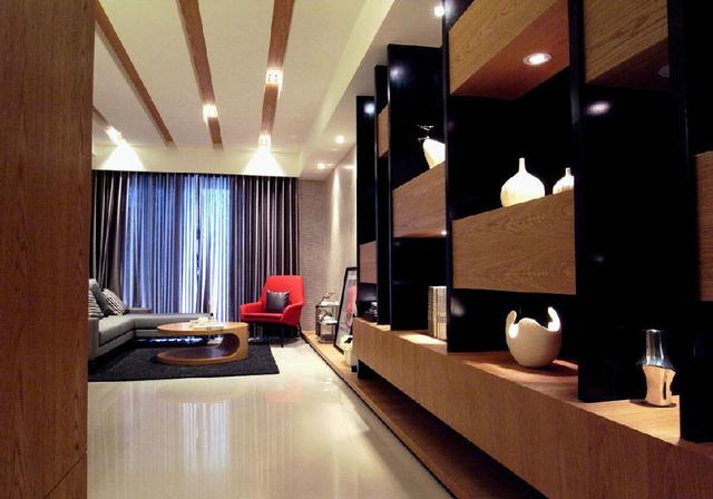 进门就是客厅,为了隐藏横梁,在横梁的下方设置了一组充满原木质感的双色展示柜。黑色与原木色组的展示柜,看起来非常的大气美观,同时原木的使用让空间更加的接近自然。