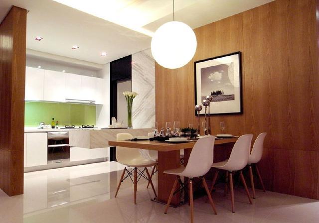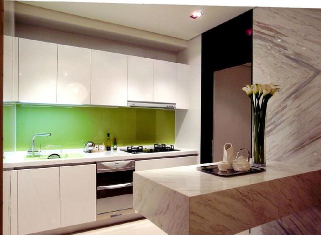 开放式的厨房设计拉大了空间感,厨房与餐厅用大理石吧台进行分隔。小型的厨房采用一字型布局的白色橱柜,显的简洁但不失格调。