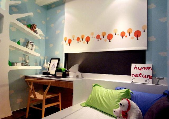 为了打造童话般的世界,在儿童房的墙面使用蓝色的乳胶漆,配合白云,非常可爱。童趣十足的树型的书柜,不仅拥有很好的置物功能,轻易营造出一个卡通的童话世界。