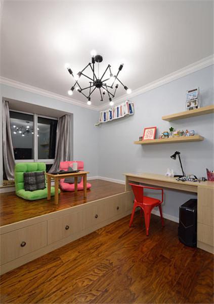 次卧被设计成榻榻米的形式,配合小小的工作台,家居工作两不误。