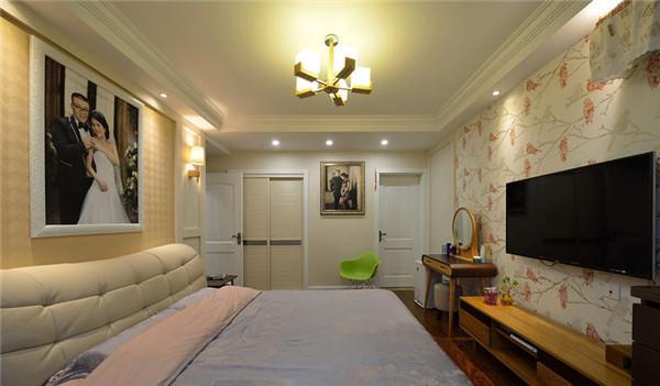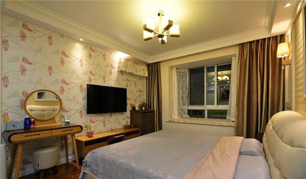 主卧的墙面采用花纹墙纸进行装修,让这个卧室有种欧美风格的韵味。与客厅电视柜同类风格的小小化妆台,配合精致的小地柜,让整个空间温馨而浪漫。
