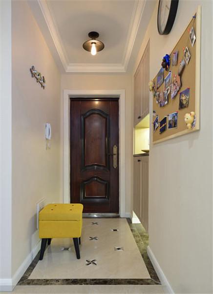 进门过道,入墙式的鞋柜非常不错,上面的柜子可以存放一些日用品,下面的柜子放鞋,中间部分可以随手放包、钥匙等,还配了一个温馨的小黄凳,平时换鞋非常方便。最有心的就是墙面上可以贴标签的小黄板,可以互相留言,也可记录平时的杂事,以防忘记。