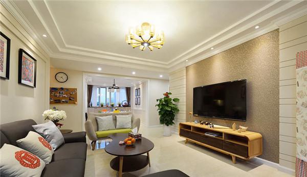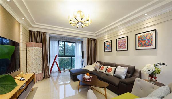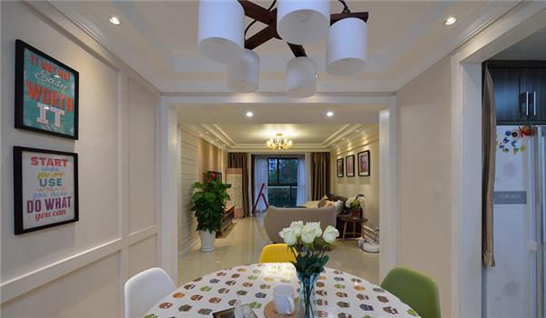 沙发后的墙面挂上几幅持画,有种北欧风的清新。楼层不是很高,吊顶部分就未做过多修饰,配合漂亮的吊灯,使整个客没有压抑感,却有种大气的美观。