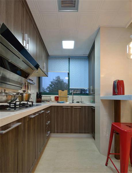 L型的厨房没有装门,用大理石订制一个小吧台进行分隔。