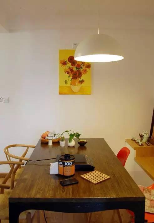 简陋的木质餐桌,看起来学是蛮有质感的,墙壁上的向日葵画框及餐桌上的绿色小植物,让空间充满温馨。