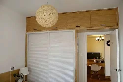 主卧就在书房的后面,同样是木色和白色的色调,为了有效的利用空间,特意订制并到顶的推拉门衣柜,麻球吊灯十分的有设计感。