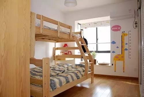 儿童房同样采用与主卧一样的白色移门衣柜,特意挑选的双层木床,门饰和墙饰上贴了一些可爱的小贴纸来体现童趣。儿童房里还有个不错的小飘窗,让这个空间的采光非常不错。