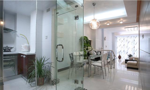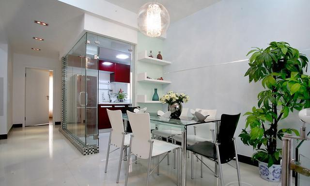 客餐厅一体式设计,简约式的餐桌餐椅。厨房装修是亮点,由于厨房的阳光不好,所以用玻璃做墙体,让错暗的厨房光线充足。非常满意厨房的装修效果,老公没去干装修真是可惜了。