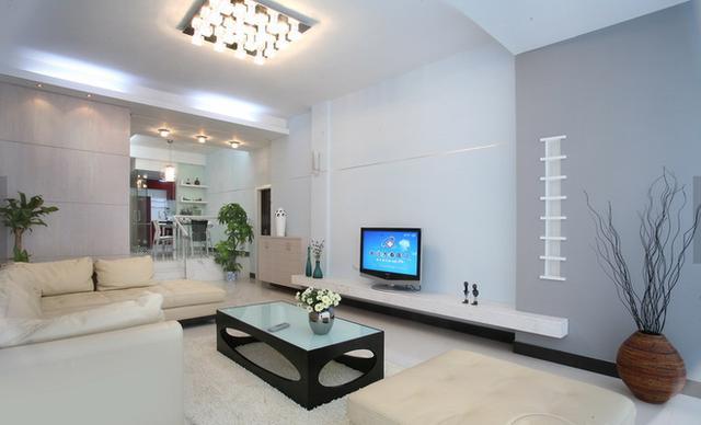 客厅面积小,所以打通了阳台,利用阳台空间。为了隐藏阳台与客厅中的横梁,阳台部分进行了简单的吊顶。客厅墙面只是简的刷白,没有做吊顶,看起来效果却非常的喜欢。