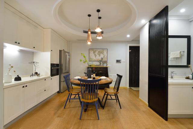 客厅的另外一头是餐厅,为了与客厅进行区分,餐厅的顶部进行了圆形的吊顶。