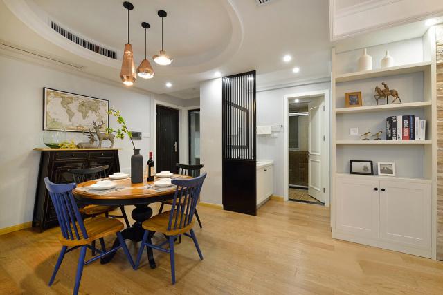 圆形的实木餐桌及餐椅,展现着古典美式的韵味,利用本空间订制的餐边柜有着很好的收纳空间同时在视觉上也为整个餐厅起到修饰作用!圆形的吊顶装饰灯与圆木餐桌相呼应搭配,显示其简单个性的特点!