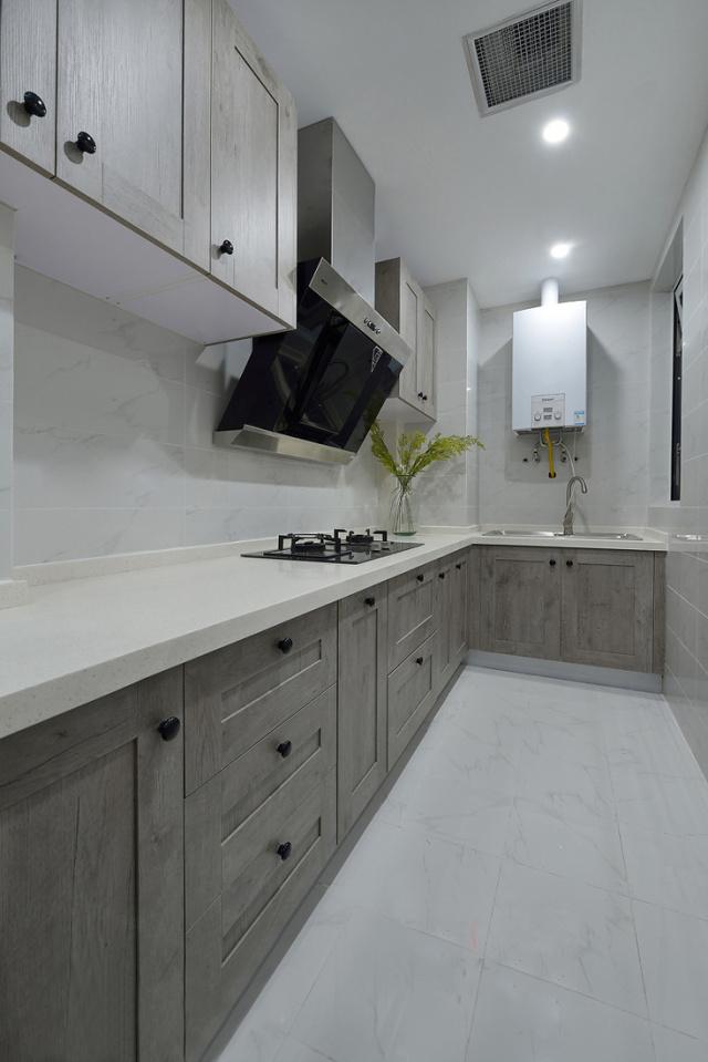 狭长的厨房最适合L型厨房布局了,深色做旧的橱柜门把美式特点进一步加强。