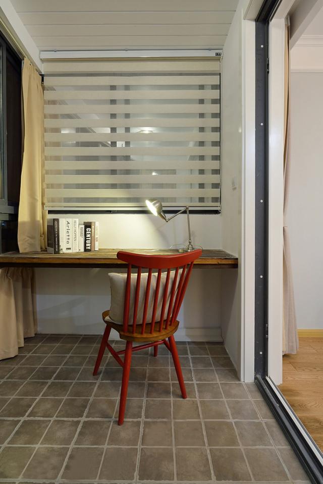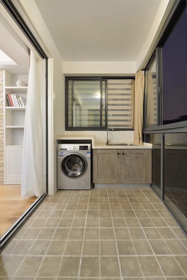 客厅与阳台打通后,把阳台改造了一个多功能的小空间。一边是学习工作的小书房,另外一边则是摆放洗衣机的好地方,地砖却采用了防滑的打磨地砖!