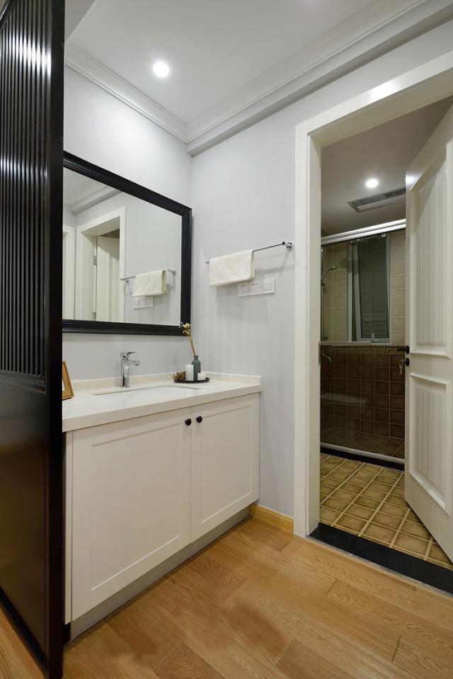将卫生间洗手台安置在外面,通过木质镂空的隔断进行遮挡,非常巧妙的优化设计。