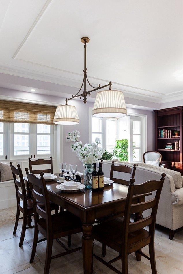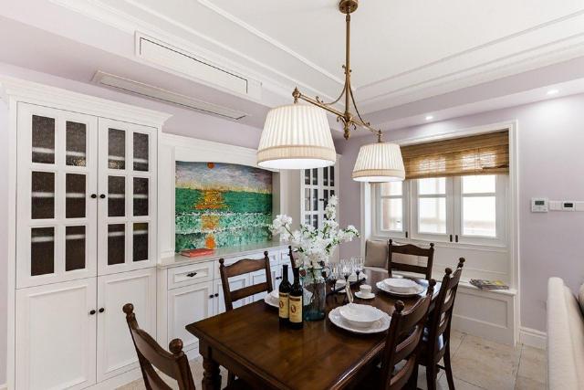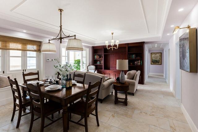 没欧式金壁辉煌的奢华感,但无处不在的温暖、简洁、干净扑面而来。没有各种缤纷的色彩,只要淡淡的宁静,在空间里四处的弥漫。色彩古朴的电视柜、造型简单的餐桌餐椅展现着美式装修风格粗矿的特点。并不夸张的吊顶,线条优美的吊灯让这个美式空间充满着熟悉的味道。