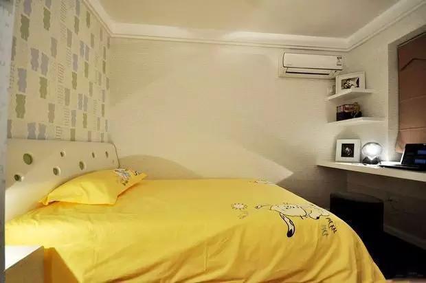儿童房都准备好了,还早着呢。可爱的黄色让这个简单的空间瞬充满了童趣,利用飘窗和墙角做了写字台和书架的设计。