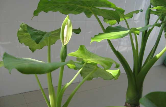 如果环境湿度过大会从它阔大的叶片上往下滴水,其花是肉穗花序,外有一大型绿色佛焰苞,开展成舟型,如同观音座像,故而得名“滴水观音”。滴水观音能够吸收空气中的灰尘改善家居环境,净化家居的空气。