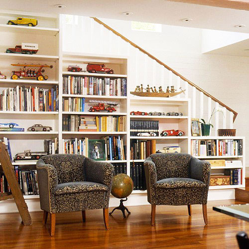 充分利用楼梯的空间,让储藏书籍和提高装修档次两不误。书柜要避免受到阳光直射,太过强烈的光照会对书籍的收藏和保养造成不利影响;但是也不能把书放在太过阴暗的地方,应该充分保证书柜的通风、透气和干燥。