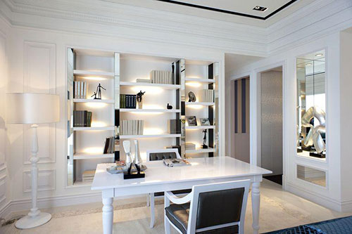 超简洁现代的设计风格,好干净好安逸,设计师将这个小小的书房设计的如果有品味!可以把书桌和书柜连在一起,这样的设计可以对室内的空间进行整体的利用。对于面积比较小的书房来说,这是比较常用的设计手法。