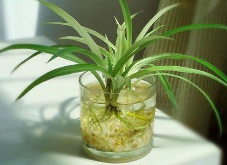 吊兰可在室内水养,不仅可以净化空气,而且外形美观、管理简便。将盆栽吊兰挖出,去根部泥土,剪去老根、烂根,留下须根,放入容器瓶内,瓶里装入清水和花卉营养液,让吊兰根部浸于水中生长即可。