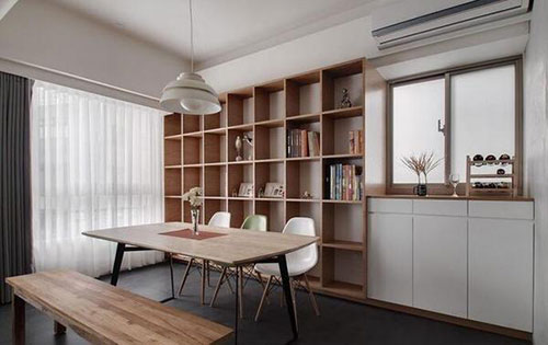 简约中透漏出的那份宁静感足以打动许多人。大大的落地窗让阳光洒满整个房间,嵌入式的书柜让再多的书籍也不怕,简洁的木质长桌满足几个人同时工作学习。