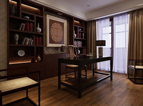 古色古香中透漏出的那份文化底韵,深色系的书柜、书桌、地板充分展示着中国古典文化,有没有一种头悬梁、锥刺骨的紧迫感。