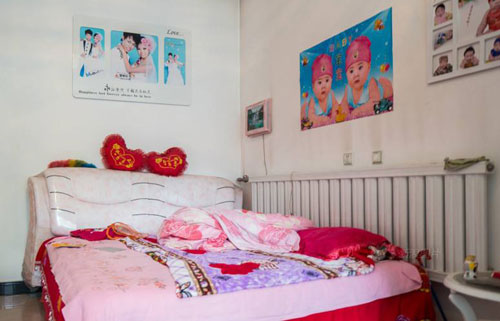 大红的床单、两床棉被,婚房就应该这样来装扮。虽说整体装修毫无特点,但结婚的喜庆气氛却爆棚。