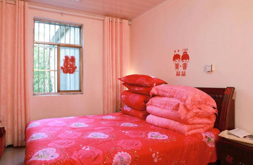 现在的农村在对婚房装扮时,越来越向城市靠拢,床头也流行摆结婚照了,但还是保留了摆放大红的床上用品这个习俗。窗玻璃上的大红的“囍”字那是必须要有的。