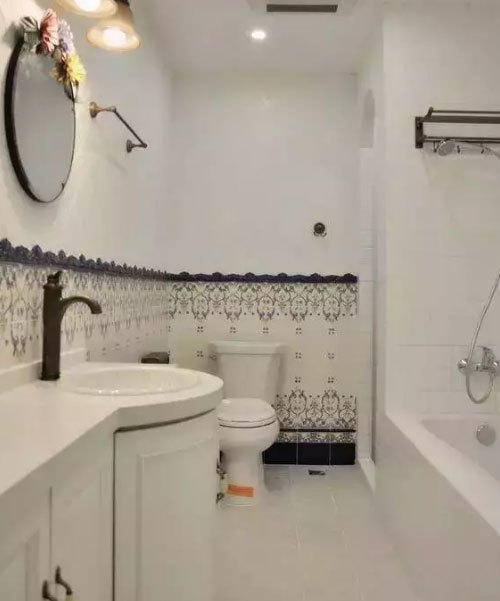 白色的卫浴空间,仿佛置身于冬日的雪地中,墙裙瓷砖搭配黑色的花纹,黑白搭配,永远的经典。
