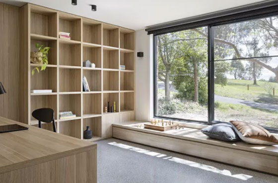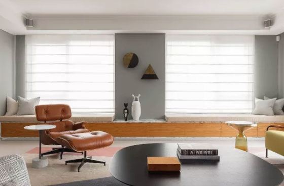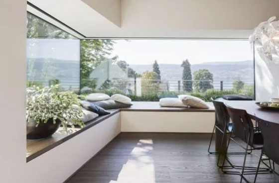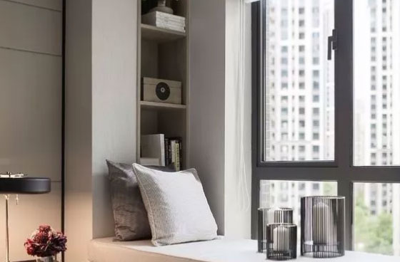 一字型的飘窗非常适合大窗户,而飘窗的底部可以设计成抽屉式,以增加收纳空间。