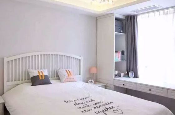 如果卧室的飘窗高度与床的高度平,那就把床紧挨着飘窗摆放,让飘窗变成床头柜。如果卧室的收纳空间不够用,那可以利用飘窗设计一排小柜子。