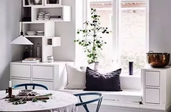 也可以利用飘窗两侧的墙面空间进收纳空间的设计,简单的设置一些搁板,成为一组漂亮的装饰柜。