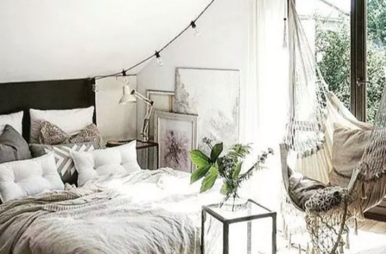 将阁楼装修成卧室是比较多的方式,可以解决家里卧室不足的问题。国外的许多家庭会将阁楼改造成卧室,无论是自住还是出租都是非常不错的选择。经常看见电视剧里的留学生,都会租住在这样的阁楼中。可以在小卧室里挂张吊袋,也可以摆上几盆盆栽来装饰,如果空间允计时,可以摆放一张书柜,提升阁楼的实用性。