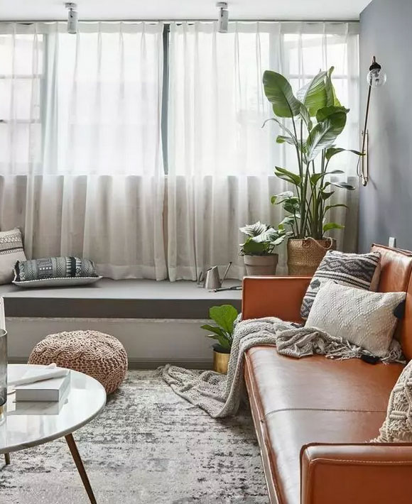 有点北欧风慵懒舒适的客厅空间,窗台下定制的飘窗,配上白色的窗纱,再搭配一张棕色的布艺沙发,营造出惬意的生活环境别具一丝高雅的格调。