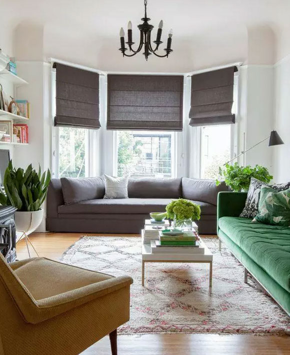 这个没有阳台的客厅,色彩搭配相对要活泼许多,白色的墙面,棕色的木地板,深灰色的飘窗沙发,绿色和棕色的布艺沙发,带给我们另外一种家居体验。