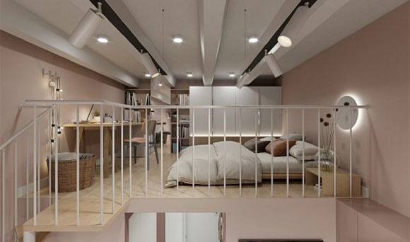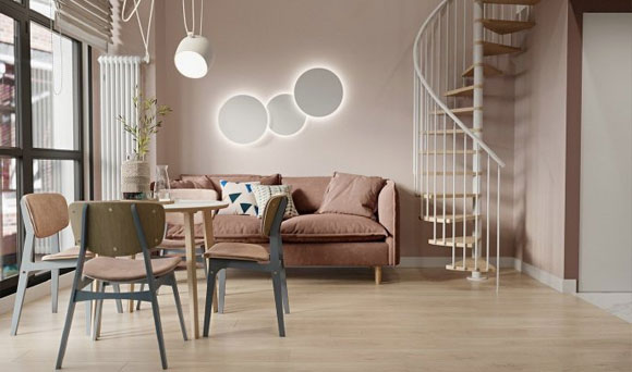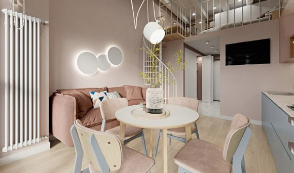 北欧风LOFT装修设计,旋转楼梯造型优雅,这样的粉色真漂亮!