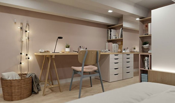 最喜欢的就是床尾靠墙摆放的简易书桌,无论是工作还是学习,这样的设计方式都非常不错,小小的空间满足家居生活的所有要求,以及对于未来生活有的美好憧憬。。