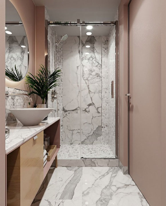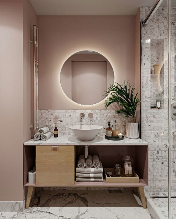 色彩搭配一直都是家庭装修设计的灵魂,比案中大面积使用粉灰色,营造出的家居氛围显得特别温暖,将北欧风的舒适与惬意进行更好的诠释。进门处的过道,地面采用纹理感很强的白色瓷砖来装饰,墙面刷上粉色加灰色调配出来的颜色,让人一进门就能感受与众不同的家居氛围。墙面的挂钩、圆镜,地面上摆放的半人高鞋柜,恰到好处的软装搭配简洁而时尚。