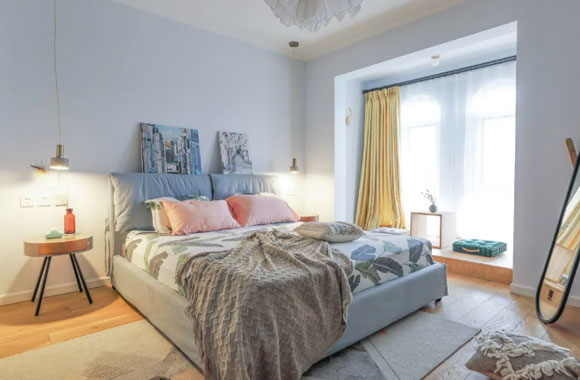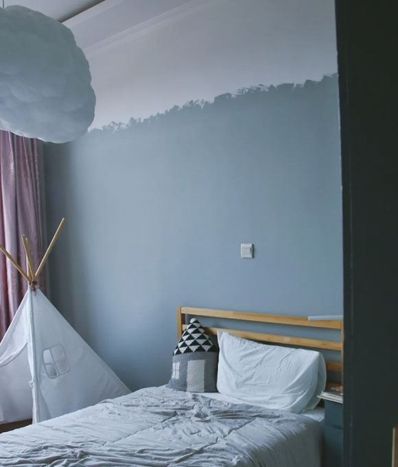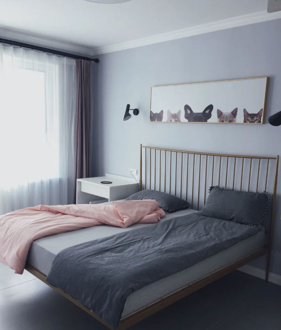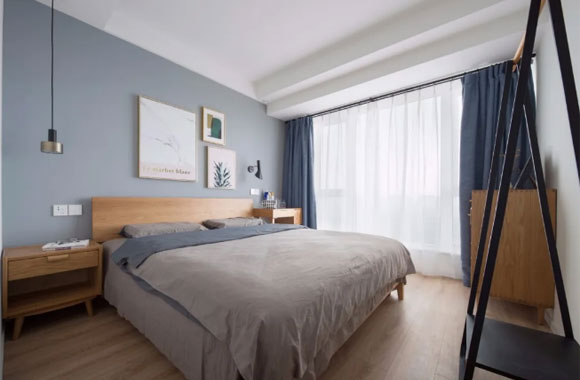 淡淡的蓝灰色乳胶漆装饰卧室的床头背景墙,简约时尚的睡眠环境看起来赏心悦目,自然能够带来更加舒适的睡眠体验。