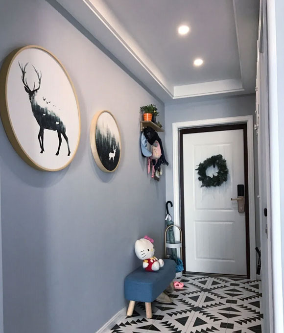 入户过道是进入家中的第一道风景线,采用蓝灰色乳胶漆来装饰过道的墙面,再配上白色的门洞、踢脚线,让人一进门就能感受到北欧风设计的温馨与惬意。