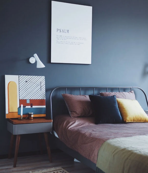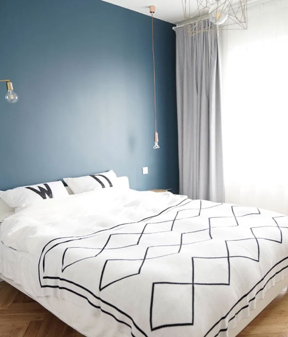 深蓝色乳胶漆装饰床头背景墙,整间卧室看起来更加醒目,层次感也更加丰富。