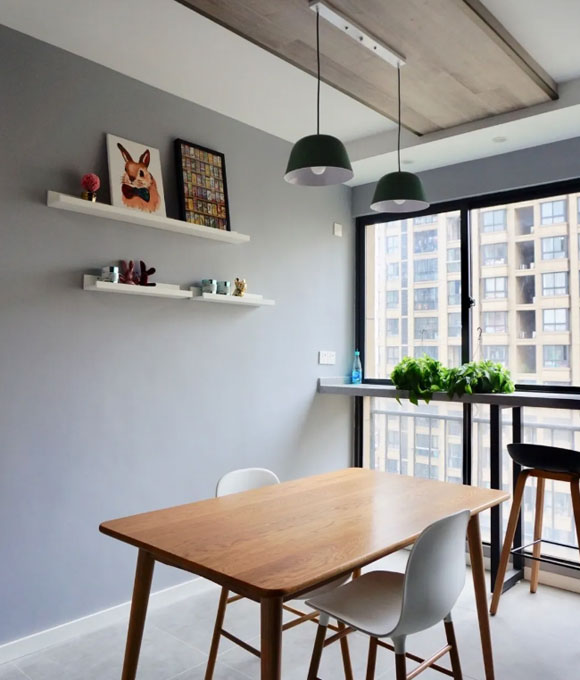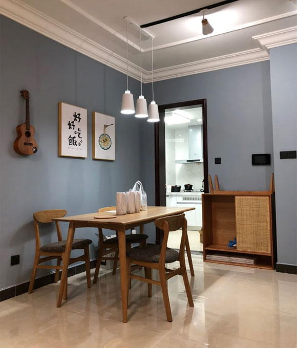 餐厅的墙面同样可以利用蓝灰色乳胶漆来装饰,再配上原木色实木餐桌餐椅,简洁清爽又不失温馨的用餐环境。