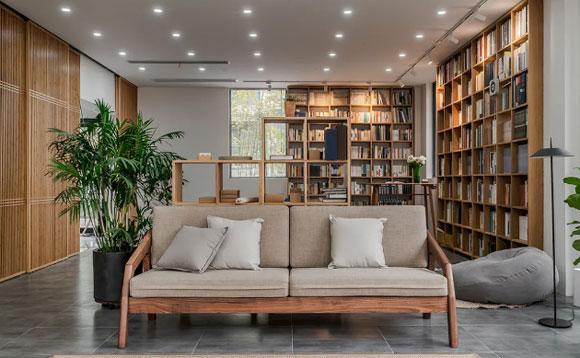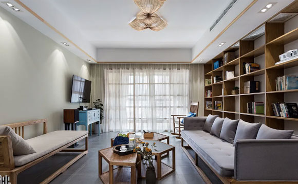 客厅书房一体的户型,可以考虑在沙发后放置一张置物架,不仅能够起到隔断空间的作用,还有一定的收纳能力,装饰效果也非常不错。