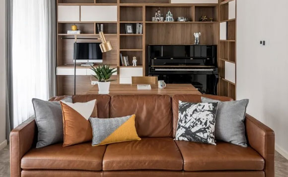 当然,你也可以把书房中的书桌直接放置在沙发的后面,拓展空间的功能性。沙发与墙面保持一定距离,增加家中的活动空间,让客厅的整个布局完全变样。